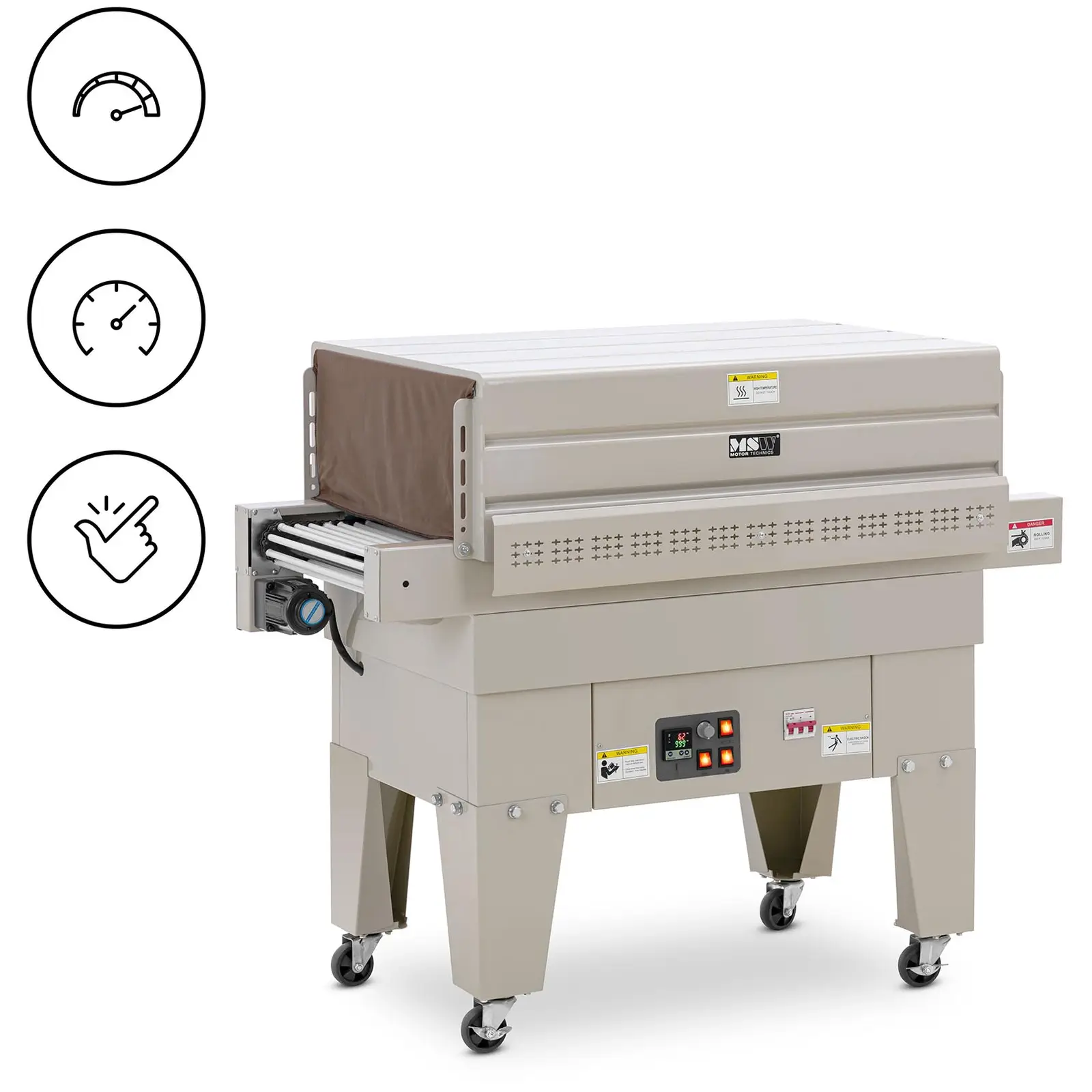 • Justerbar – reguler temperaturen på krympeenheten for forskjellige oppgaver, fra romtemperatur til 180°C, og kontroller hastigheten fra 0 til 10 m/min.